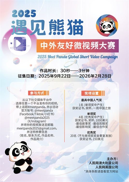 由人民网澳大利亚公司、人民网英国公司联合主办的2025“遇见熊猫”中外友好微视频征集大赛将于2025年9月22日正式启幕,并持续至2026年2月28日,面向全球网民广泛征集参赛作品。 本届大赛以“跨