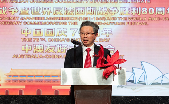 人民网悉尼9月30日电 为纪念中国人民抗日战争暨世界反法西斯战争胜利80周年、庆祝中华人民共和国成立76周年并喜迎中秋佳节,澳大利亚华人团体协会于27日晚在悉尼举行庆祝活动,中澳政商界代表、澳大利亚华