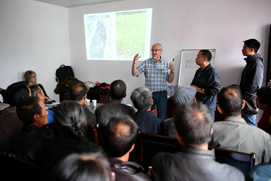 哈维在宁夏固原市西吉县田坪乡燕李村为农户授课。新华社记者 王鹏 摄